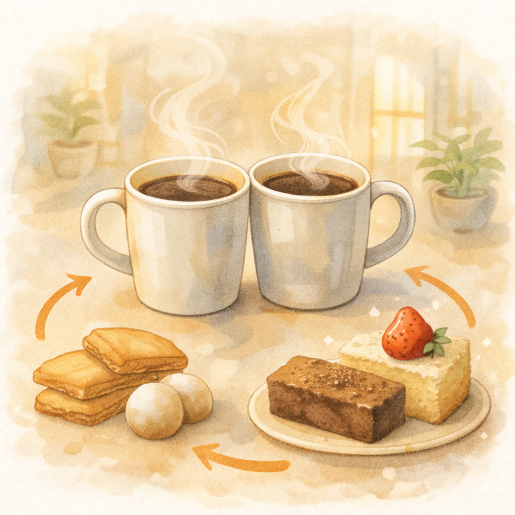 ペアリングという言葉から、難しい組み合わせを想像してしまうかもしれません。けれど、コーヒーとお菓子の関係は、もっと気楽なもの。味を引き立て合う、というより、同じ時間に並ぶ存在として考えると、ちょうどよいかもしれません。